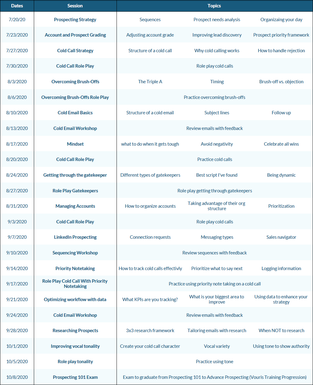 There it is folks, in all its glory! This is the basic framework I use for structuring all of my training programs. I have populated it with part of my basic training program, called Prospecting 101.