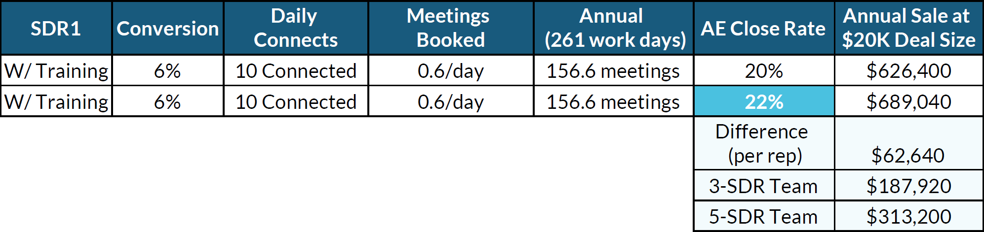 In our example SDR 1 was trained and increased their conversion from 5% to 6%, generating an additional $167,040 in sales… If the close rate increases from 20% to 22% because of higher quality SDR meetings that would generate $62,640 extra in sales attributed to SDR 1.